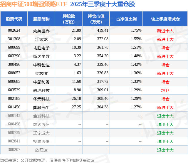 从基金规模来看道正网配资,招商中证500增强策略ETF基金2025年三季度公布的基金规模为2.4亿元,较上一期规模8039.07万元变化了1.59亿元,环比变化了198.27%。该基金最新一期资产配置为:股票占净值比98.33%,无债券类资产,现金占净值比1.88%。从基金持仓来看,该基金当季前十大股票仓位达14.25%,第一大重仓股为完美世界(002624),持仓占比为1.75%。