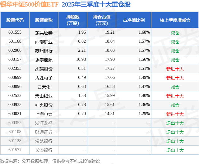从基金规模来看,银华中证500价值ETF基金2025年三季度公布的基金规模为0.11亿元,较上一期规模1487.34万元变化了-341.68万元,环比变化了-22.97%。该基金最新一期资产配置为:股票占净值比95.71%智赢策略,无债券类资产,现金占净值比5.54%。从基金持仓来看,该基金当季前十大股票仓位达14.9%,第一大重仓股为东吴证券(601555),持仓占比为1.68%。